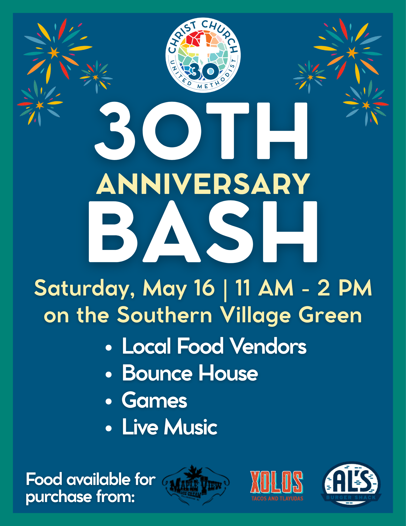 Save the date for a special celebration on Saturday, May 16th from 11:00 a.m. to 2:00 p.m. on the Southern Village Green! Enjoy food available for purchase from Al’s Burger Shack, Xolos, and Maple View Ice Cream, live music from local artists including Brassissimo!, Bill Moore, Now & Then, and more, plus a bounce house and games and activities for all ages! This joyful day kicks off a weekend of celebration leading up to our charter anniversary on Sunday, May 17th. All are welcome!